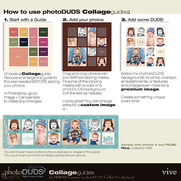 CollageGuides are the PERFECT partner for photoDUDS Toolkits & Collections! CollageGuides will help you layout multi-image galleries or cards quickly, giving you freedom and control over your final product while not compromising design.